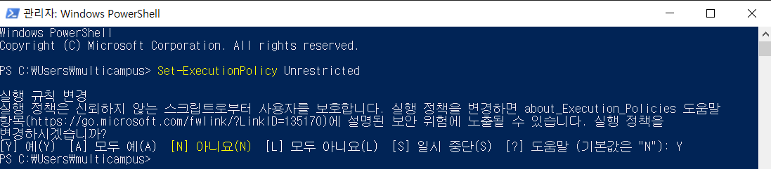- 관리자권한으로 Powershell을 킨후 다음과 같은 코드를 입력합니다.